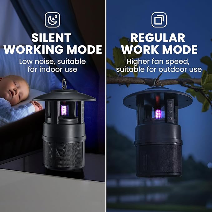 ✅ وضع صامت – ضجيج منخفض، مثالي لغرفة النوم. ✅ وضع عادي – سرعة مروحة أعلى للاستخدام الخارجي. ✅ آمن وصديق للبيئة – بدون مواد كيميائية. ✅ يجذب الحشرات بالضوء البنفسجي ويجمعها في حاوية سهلة التنظيف.